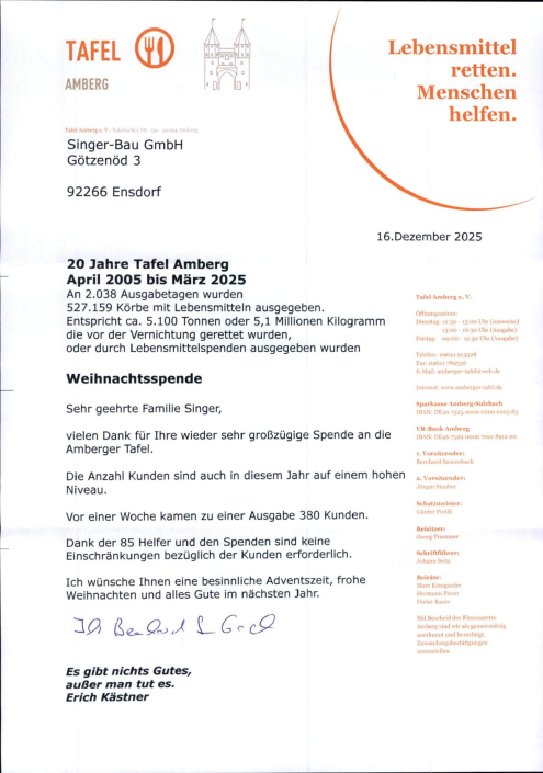 Mit unserer Spende unterstützen wir die wertvolle Arbeit der Amberger Tafel, die täglich vielen Menschen in unserer Region hilft.